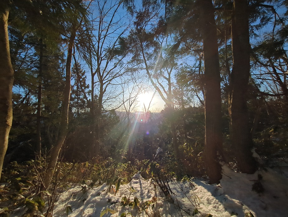 植林の杉林の合間から朝日が昇ってきた。