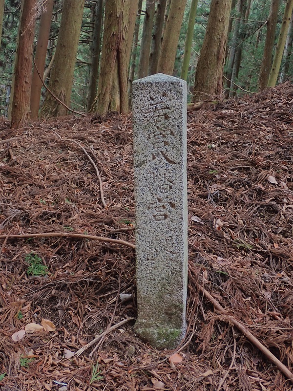 上仁柿の坂ノ下公民館に駐車し伊勢本街道を歩く。橋を渡った所に勢至大菩薩という石像が祀られていた。先の林道の分岐には古坂道と櫃坂道の道標があり谷を進み中俣に入る。植林に入ると古坂道4丁の看板があった。ただ、これ以降は奥峠まで看板はあらわれずテープと赤杭にそって進んでいく。石垣がいくつも出てくるので田畑があったようだ。古道の場所には赤杭が2本打たれており溝道が時たまあらわれてくる。植林の中なので、これがないと古道をたどるのは難しい。