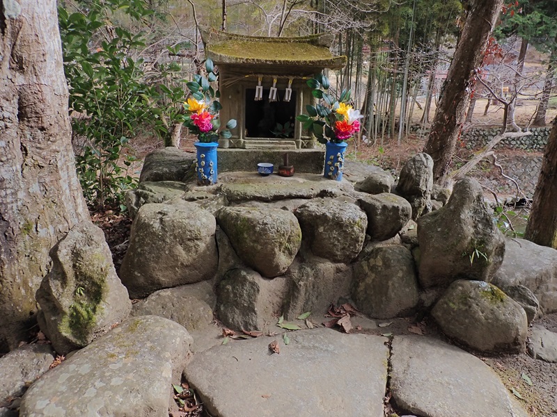 奥峠から立川源流の小道沿いには沢山の石垣が広域に広がっている。どうも集落があったようだ。奥峠という集落があったようで、墓地も出てきた。地蔵や墓に立ち寄り小屋など大きな集落であったことがわかる。伊勢湾台風をきっかけに離村したようだが、お正月のお参りの挿し木がしてあった。昔の奥峠集落の生活道路であった石垣道を歩いていくと峠集落に着いた。立川の中流に集落が出来るにしたがって現在の国道369号線にそったルートを取る人が増え江戸時代の寛文年間に現在の櫃坂道が新道として作られた。その影響で口峠と言われた現在の峠集落には7件の旅籠があった。