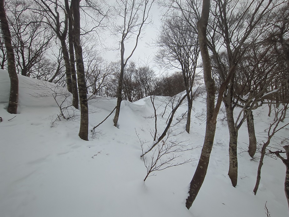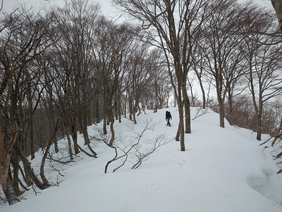 土蔵岳に近付くにつれ雪が降り始めた。この辺りは若いブナが多いようだ。