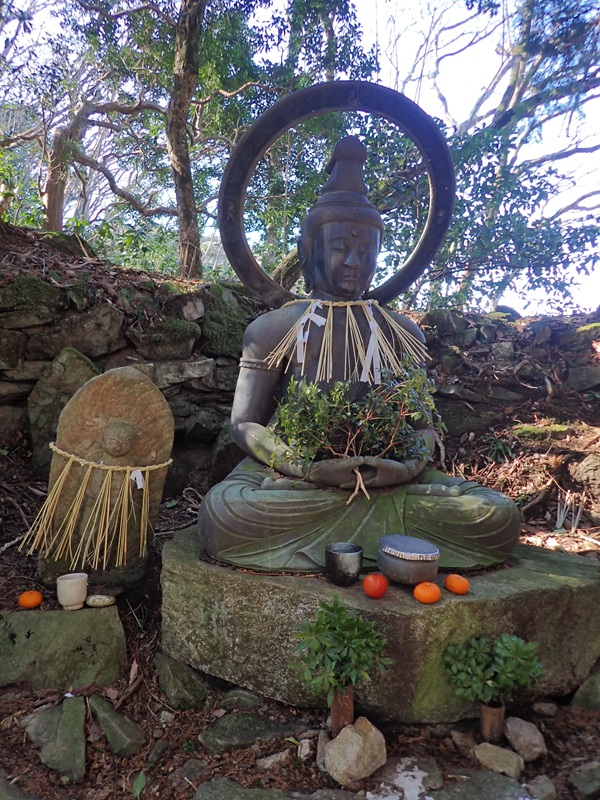 >それぞれの石像にはしきみやみかんが進ぜられ、しめ縄が掛けられていた。古いしめ縄が捨てられてあったので、正月につけかえたようだ。仏像にし