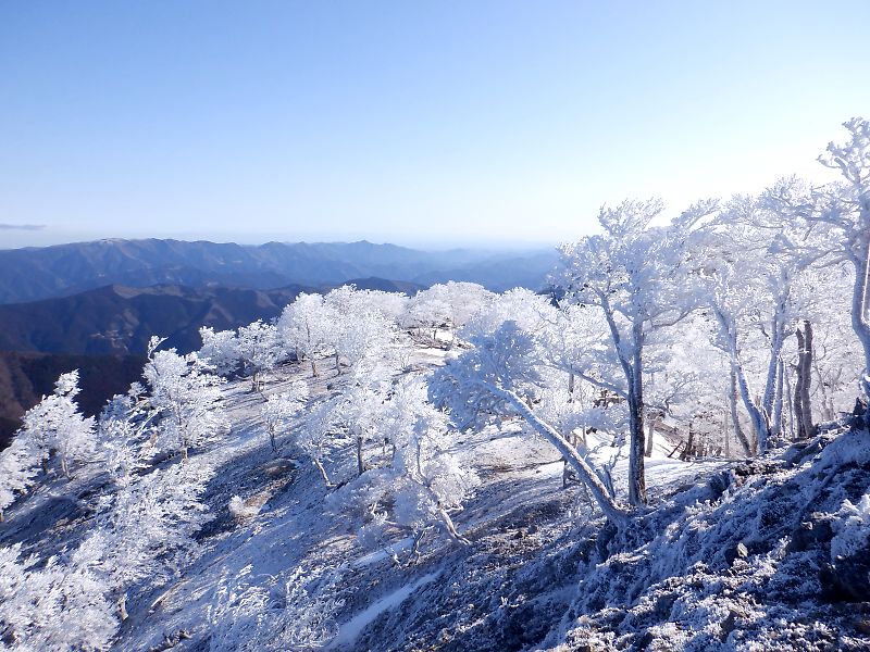 ガスが流され伊勢湾方面も綺麗に見渡せた。青空に白く輝く樹氷も映える。