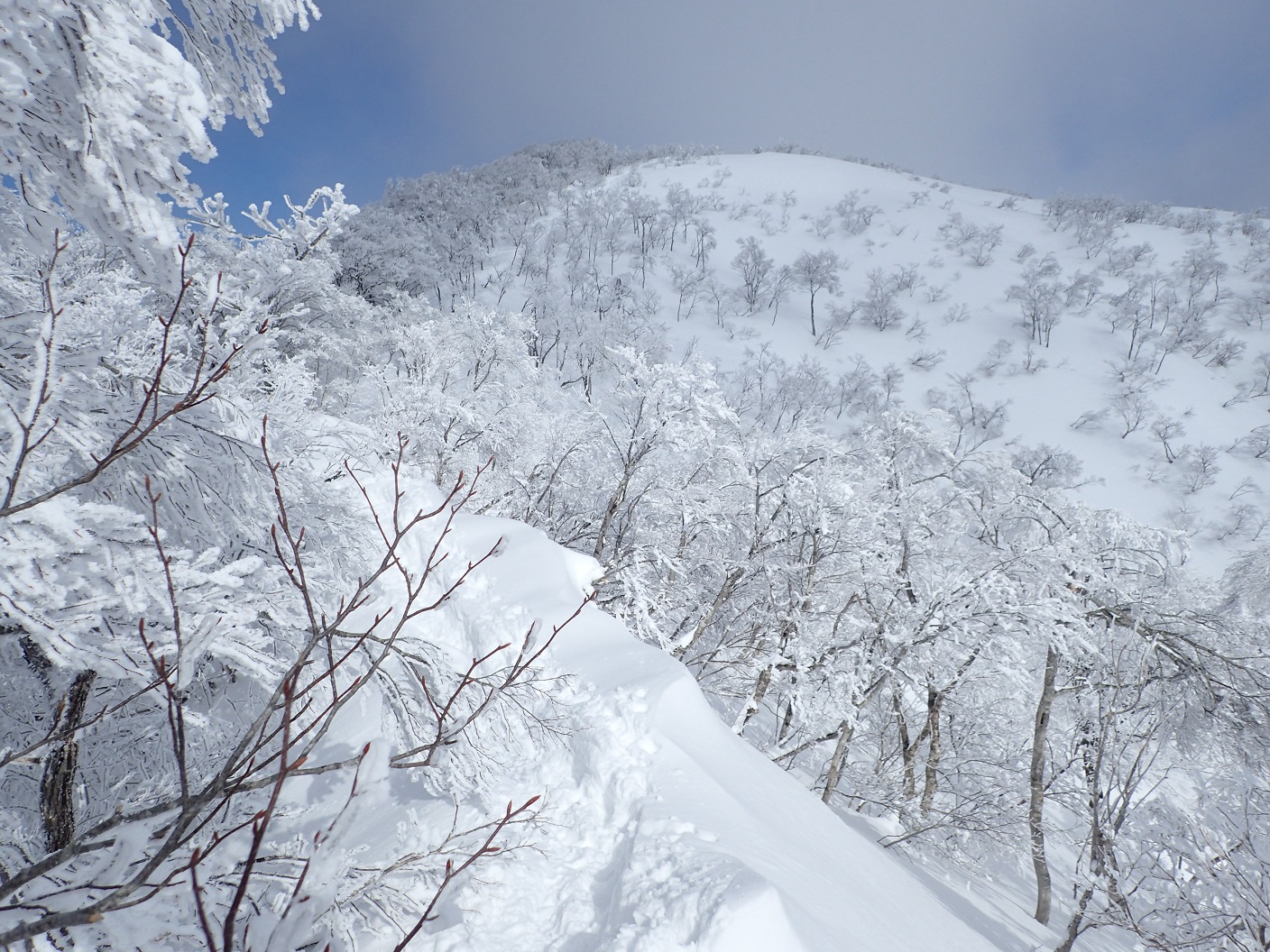 結構な急坂が続くが、藪もなく歩きやすい。高いところは鼠色のガスの中だが、登るにつれ天気が良くなってきた。標高1200mからは気持ちのいい稜線歩きとなる。冠山が格好いい。