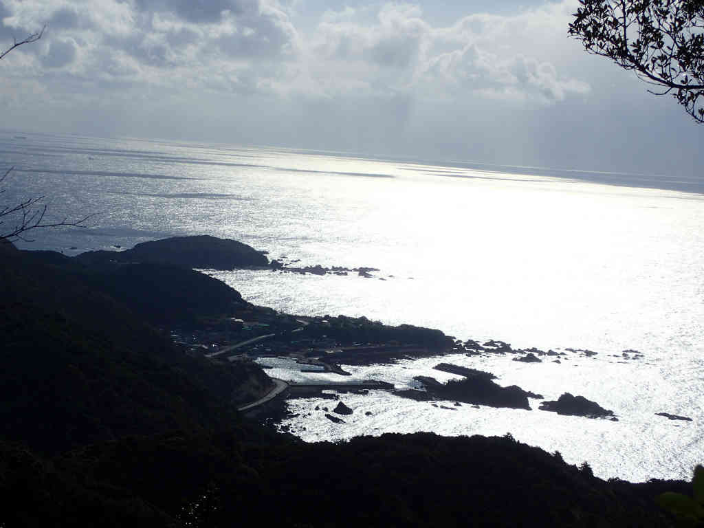 標高差200mの急登を登りきると舗装された林道にで,その後はゆるやかな登りに変わる。ゆるやかな登り道は山腹道で,北風が遮られて気持ちがい。左側を見下ろすと眼下に枯木灘が見えている。