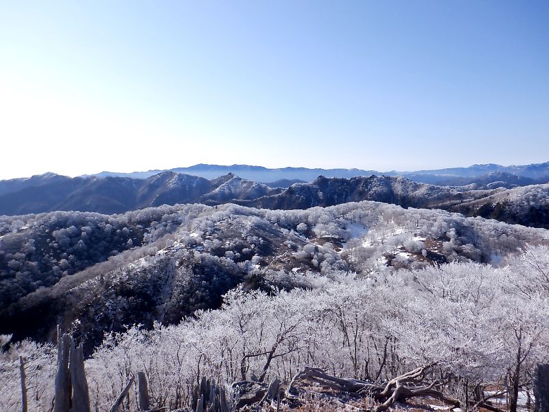 7合目で一休みし冬道の尾根を直登して行く。尾根を登っていくと美しい樹氷が出てきた。雨乞岳は別にして周りの山々には雪など見られないのにここだけは別世界だ。登りやすくて樹氷が奇麗とくれば登山者が押し寄せるのも分からなくはない。
