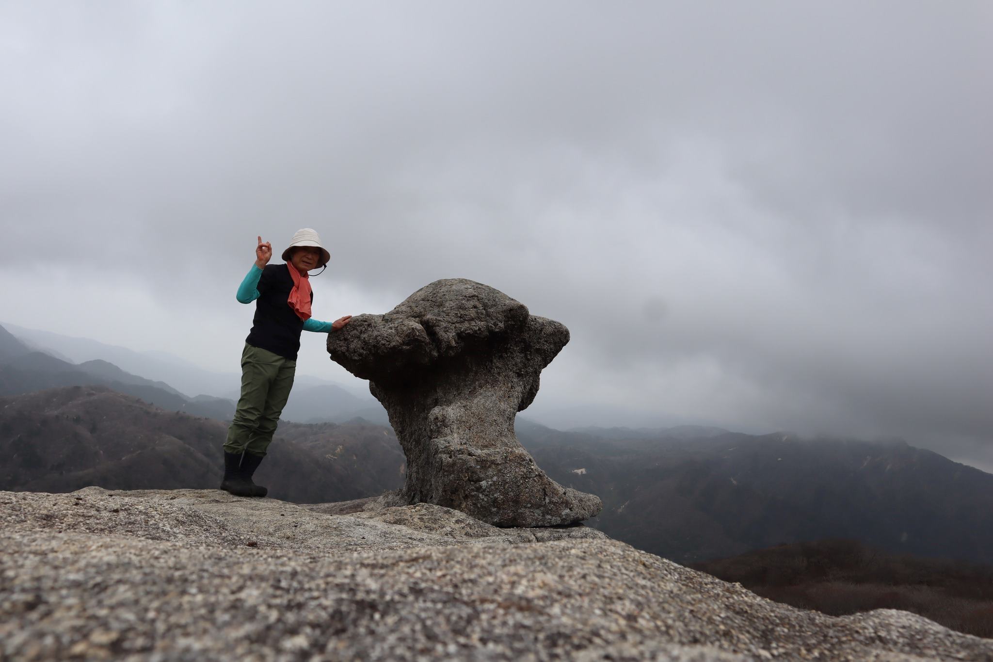 稜線に出る。大きな岩の上に小さな岩が乗っているのが見えた。「きのこ岩」の矢印に従って少し道を外れると、先ほど見た岩が出てきた。大きな岩の上の小さな岩がきのこ岩だ。