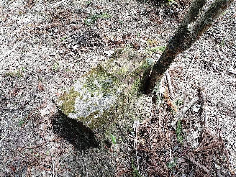 崩された土の急斜面登ると、広い平場があり製材された木が少し、落ち葉や枝が多く地面が見えていません。