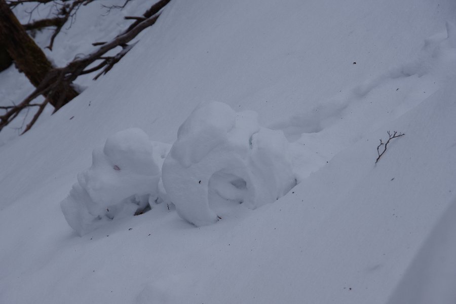 先日の水無山と高室山よりも大きなバームクーヘンが雪庇の下に転がっていたりして飽きない尾根だ。私はノースカロライナと呼んでましたが。