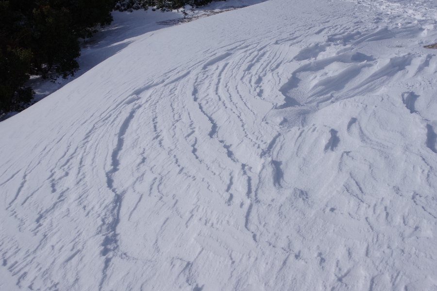 新たに降った雪でこうなったのか、強風で残雪が移動して形成されたのかは判らないけれど。