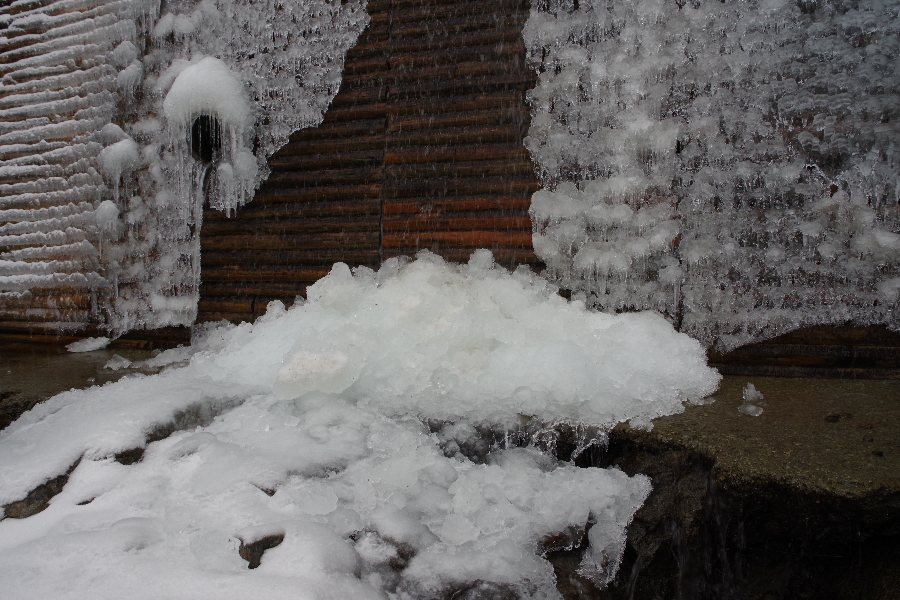 下流側の3箇所がコンクリート製で木張りの堰堤なのに対して、一番上流の1箇所は鉄製のようで、凍り方が違っていて面白い。