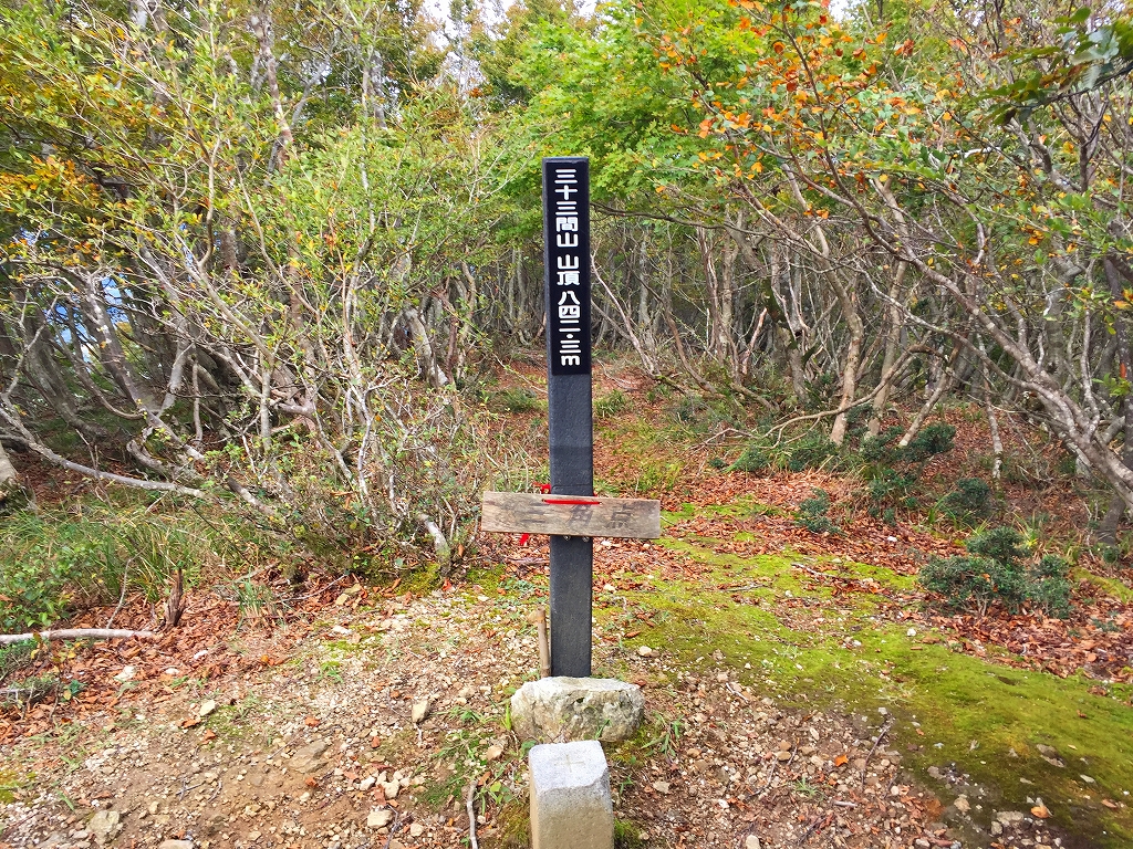最後のわずかな急登の後、三十三間山頂に到着。草原は山頂手前までで、ここから北側は樹林帯が続いている。