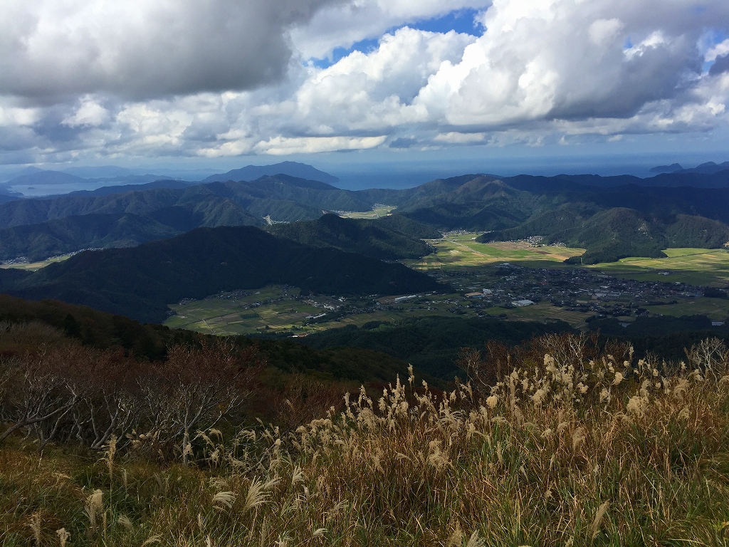 高島トレイルの山稜。三方や上中の町の広がりの奥に日本海と三方五湖の一部が見える。