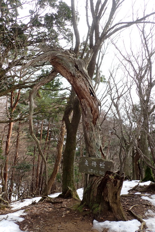 しばらくの間は感じのいい雑木の尾根だがほどなく植林に入る。夫婦松の手前からは雪が切れてスノーシューを