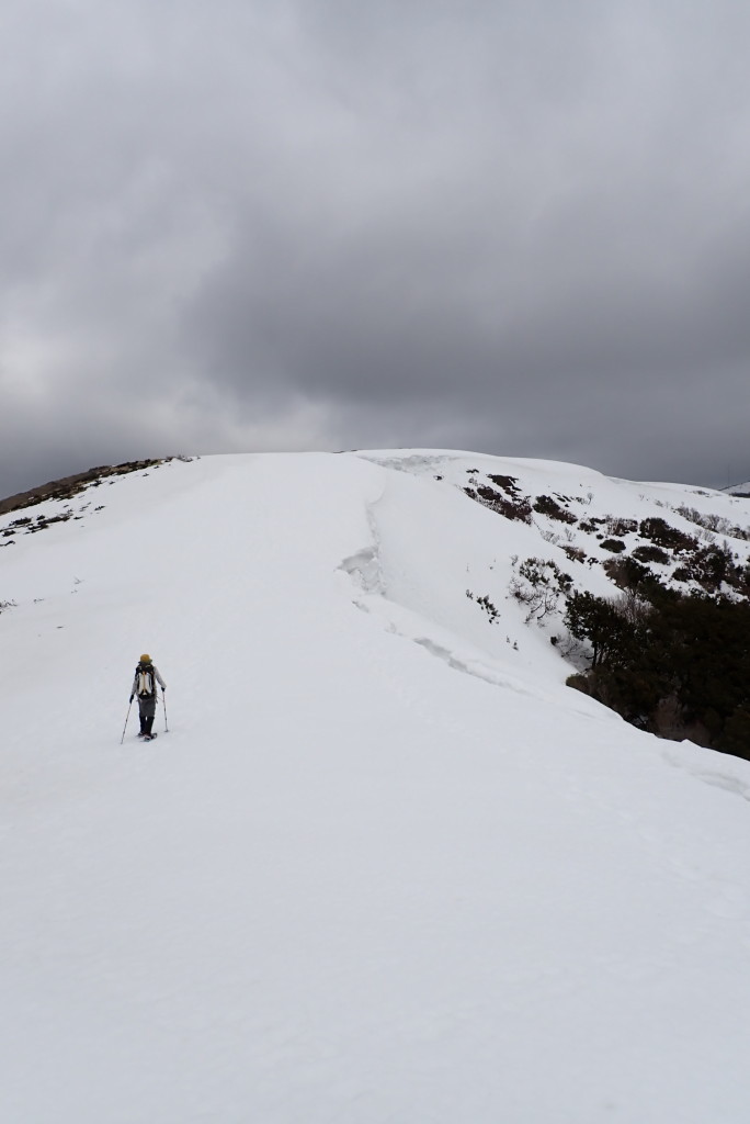 の雪尾根が続く。尾根の東側には先週の高温続きで落ちてしまった雪庇の残骸と大きなクラックが口を開けていた。