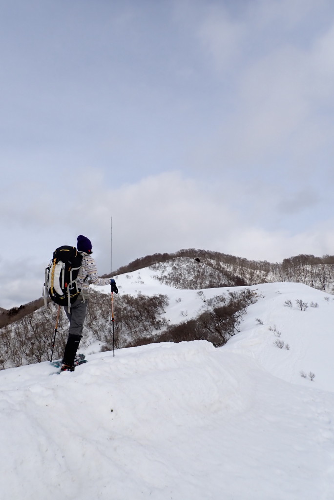 稜線に出た時、霧が流れ、まっ白な稜線が現れて感激しました。大波のような雪庇も出来ていて、ドキドキしました。雪の三十三間山は何度か訪れているのですが、踏み跡のない稜線は初めてでした。