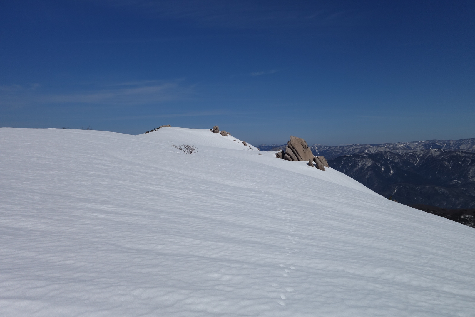 雪山に登らないと味わえない感動ですね斜面をのぼりきると大きな岩がみえる ジョーズ岩だ