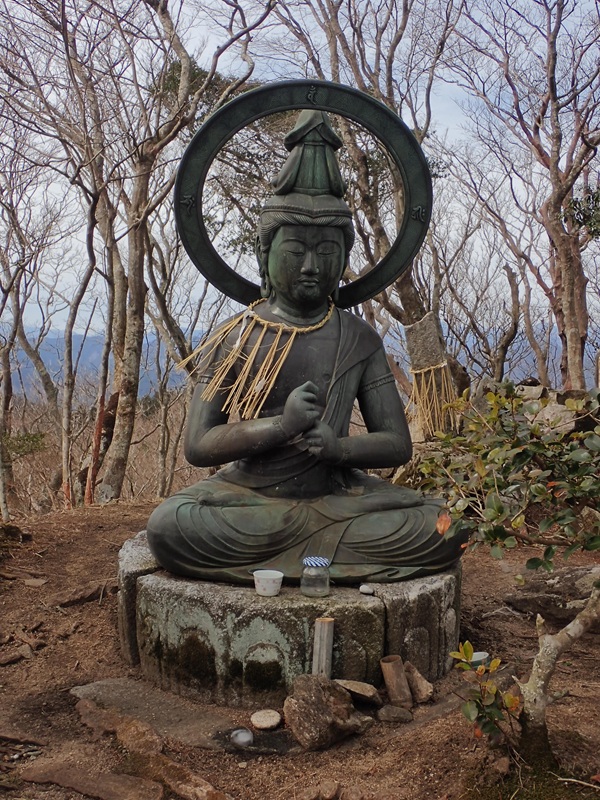 稜線を歩いた先の雌岳に着く。富士型の屋根を載せた石室に、女顔の大日如来石像が祀られており、女人結界の地になっている。掘坂山山頂には3つの尾根から破線道がつながっている。東尾根の結界が雌岳で、北尾根の結界が中宮八幡宮になる。残る南西尾根の結界が忍坊寺だったように思う。忍坊寺が人里に下りたきっかけと言われている平尾の海は、掘坂山祭事で海水を汲む作法をしていた大口浦と場所が同じなのも気になる。忍坊寺が掘坂山の参詣曼荼羅を形作る一つのピースだったことは間違いない。