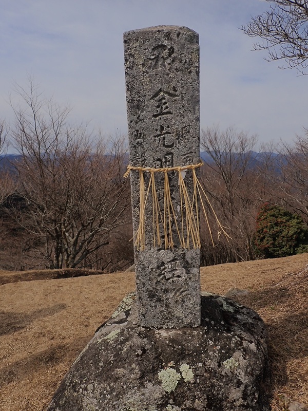 忍坊平を少し上ると破線道に合流し、登山道を進むと山頂が見えてきた。手前にある二峯には、「伊勢富士」と呼ばれる掘坂山の本地仏になる金剛界大日如来が祀られている。山頂には掘坂大権現の大きな祠がある。「権現」は「仮の姿で現れる」意味で、掘坂大権現の本地は大日如来で、掘坂大権現と大日如来は同じ仏になる。大日如来はしめ縄のネックレスをつけ、山頂には祭事で使われた弊が残されていた。