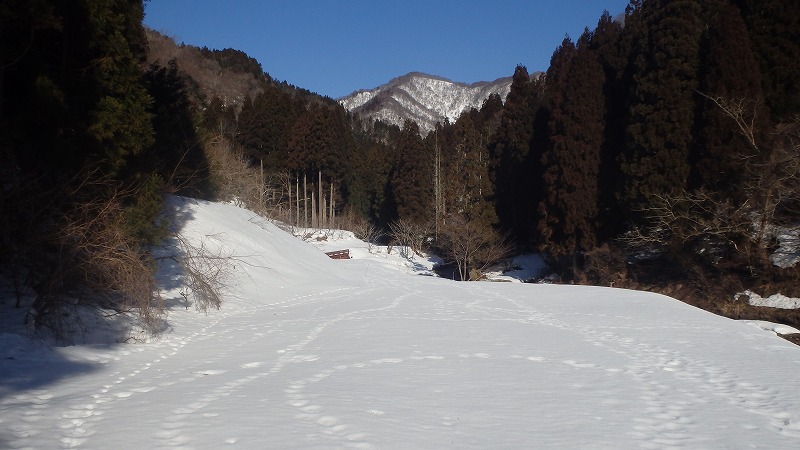 スノーシューを手にぶら下げて10分ほど洞寿院の入口まで進むと、除雪はここまで。妙理川に沿う道はしっかり雪で覆われている。5、60㎝はあるだろう。除雪による壁を乗り越えて雪上に立ち、スノーシューを履く。
