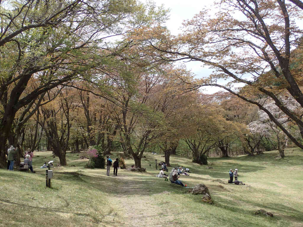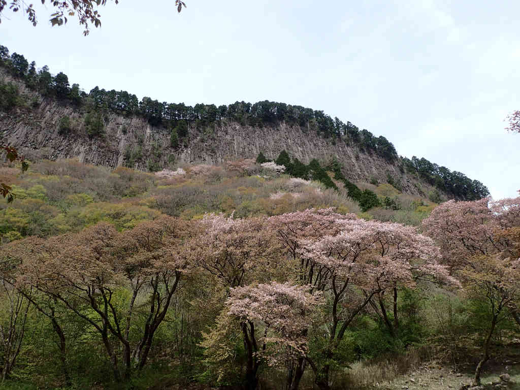 1時間ほどで屏風岩公苑着。ここにはこれまで2回来ているのだが,いずれもヤマザクラのシーズンを外しているので,満開の時に来たのは初めてだ。平日ということで人はそれほど多くはないが,それでも2,30人ほどはいるだろうか。上を見ると柱状節理の断崖,中間がヤマザクラ,下が芝の広場でいつ来てもいいところだ。サクラはそろそろ散り始めといったところか。花見をしながら昼食。