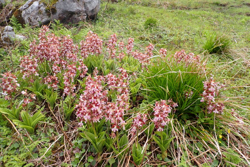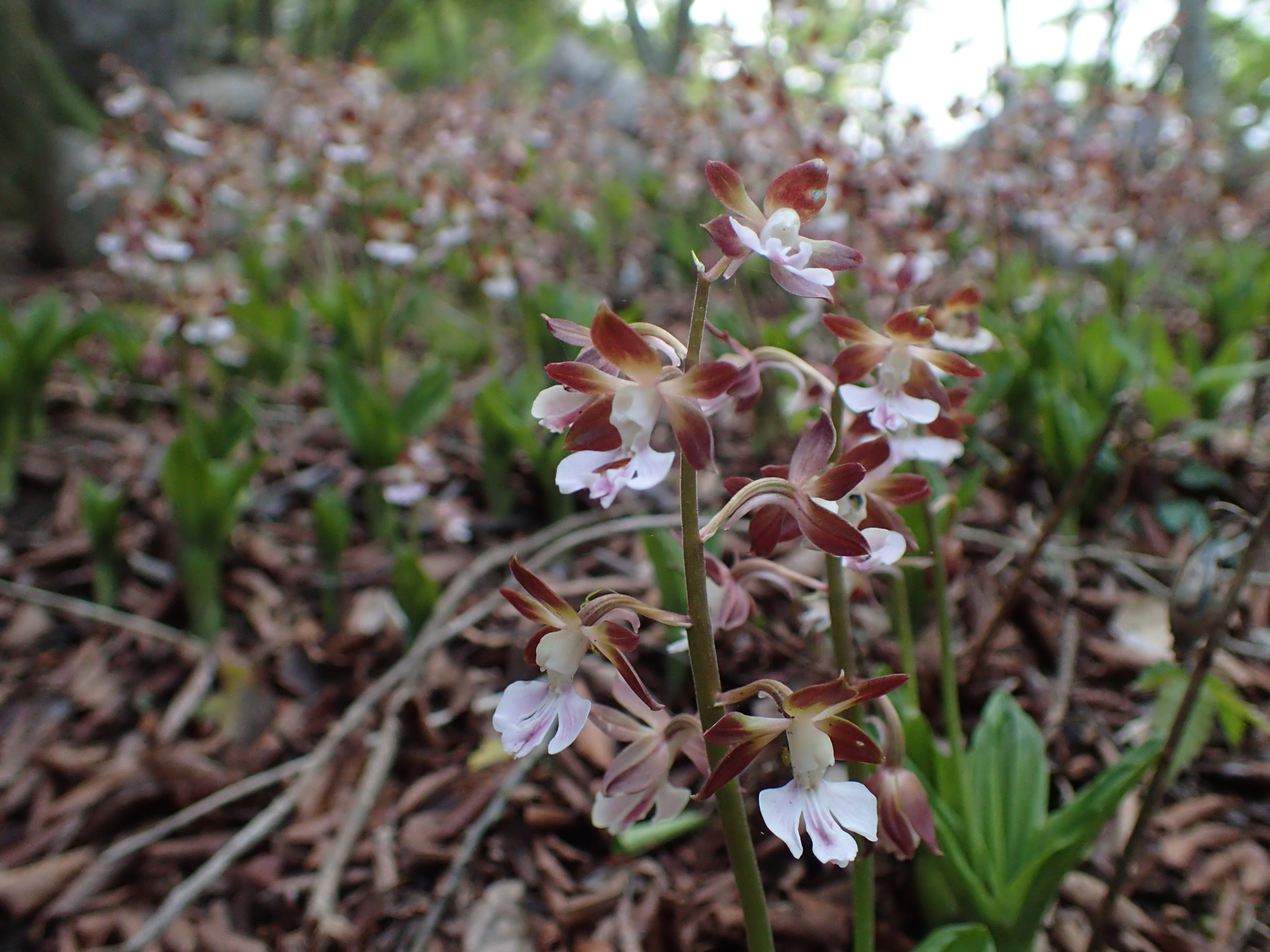 樹林帯を抜けるとヤブ無しの草原地帯に飛び出す。ちょっと紫がかった花の叢が目を惹いた。エビネだ。