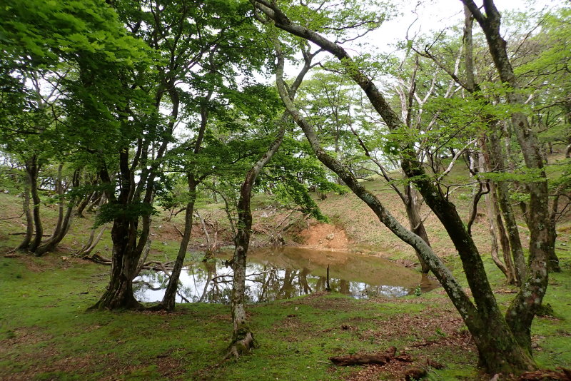 884m標高点の南側あたりである。ヤブのない谷間にはぽつりぽつりと木が立ち、傍らには小さな池も設えられている。実にいいところだ。あっちからこっちから何度も登っている霊仙だが、ここは最高の癒しの空間ではないだろうか。