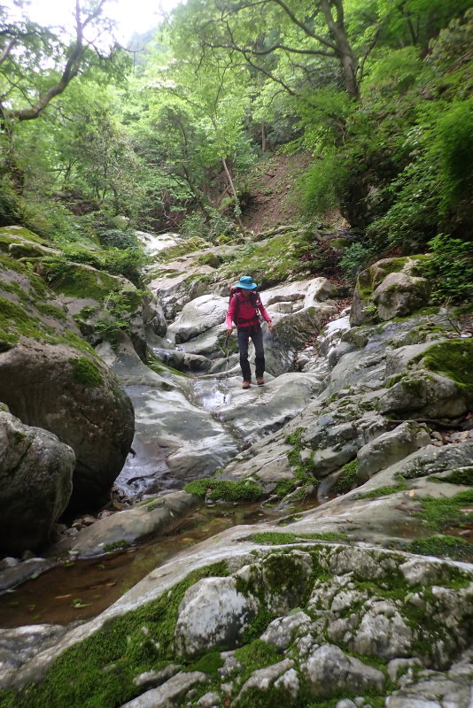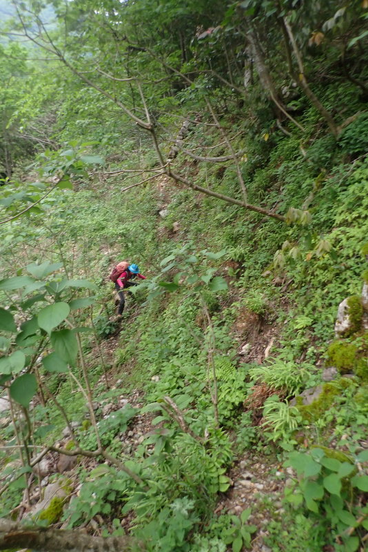ようやくまったく水の流れていない谷山谷に着地。ここからは荒れた登山道と谷芯が半々ぐらいの下降となる。