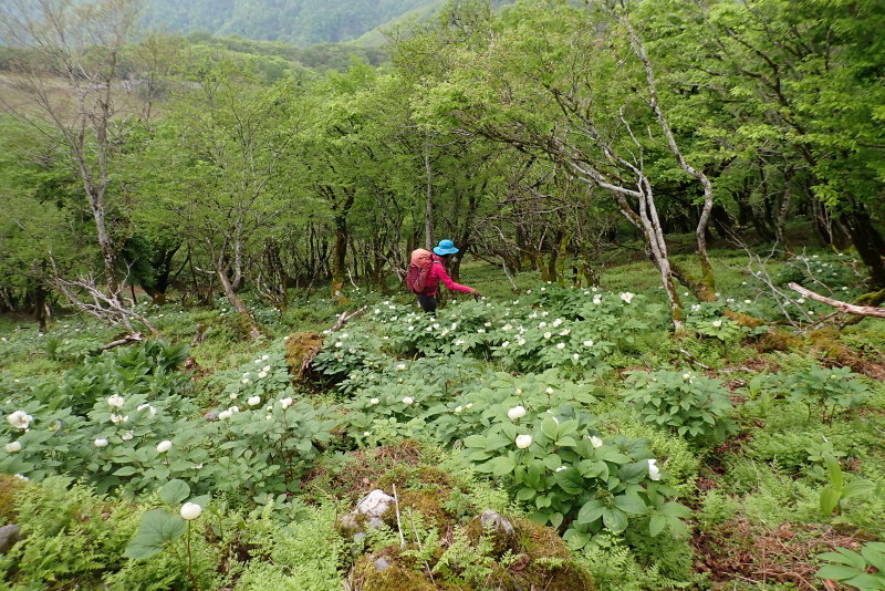 >お花畑の中をぐんぐん下って行くとやがてヤマシャクヤクも尽きて、広く緩やかな谷間の台地に下り着いた。