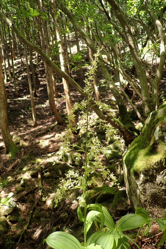 滝の上からは再び平和な流れに戻り、植林がようやく切れて自然林のグリーンシャワーを浴びる。岩は苔むして、バイケイ