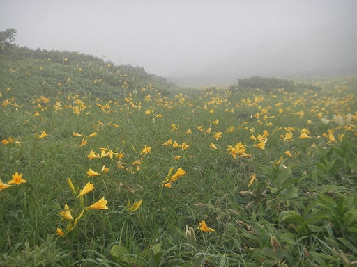 三ノ峰からコルに下り登り返すと別山平に出ました。一面を埋め尽くすニッコウキスゲもガスが晴れず霞んでいます。