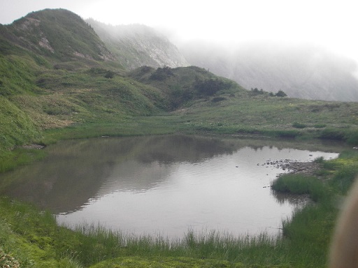 三ノ峰からコルに下り登り返すと別山平に出ました。一面を埋め尽くすニッコウキスゲもガスが晴れず霞んでいます。鏡池とも言われる御手洗池も霞んでいて別山が映っていないので帰りに寄ってみましょう。