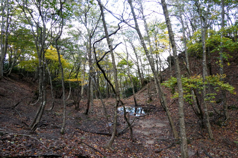 峠からまっすぐ下ってしまうのも芸がないのでブナ清水に立ち寄ることにする。紅葉はまだまだこれからで、