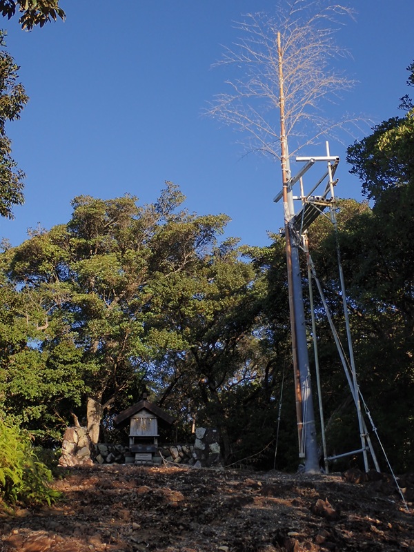 神崎浦に抜ける旧道を上ると自然石が階段状に削られており、浅間山の登り口だ。担ぎ上げる道はヤブの無い岩尾根に作られており、岩の上に担ぎ手が履いていた地下足袋のゴム底が落ちていた。方座浦が見渡せる場所に小さな竹枝の幣が二本立てられており、尾根が安定すると鳥居の先に小幣と大幣が見え浅間山だ。大正期に立てられた鳥居からは祭りの日のみ女人禁制になり、日の丸扇で飾り立てられた大小の竹幣を地面にふれないように男たちが抱え山頂の祠までいっきに駆け上がる。方座浦から見える場所に小幣を立て、石積みに囲まれた祠横には大幣を立て、名残の日の丸扇の骨がいくつも散乱していた。石積み裏には古い祠が2つ片付けてあり、何年かごとに建て替えるようだ。