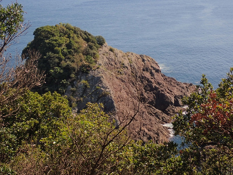旧道を峠まで歩き定ノ鼻への尾根道に入る、飛鳥神社に向かう道で方座浦のおじいさんも「飛鳥さん」と呼んでこの道の事を知っていた。中電のケーブルが続く破線道と分かれて尾根を進むと方座浦の高(157.9)でkitayamaさんのプレートが掛かっている。展望のない尾根道に日が差すのは半島が細くなるあたりで両側が切り立ち気を使う。尾根が広がりだすとウバメガシの大木が現れる。ここまでのウバメガシは通常の太さのアガリコになっていたが半島の先端は手つかずのまま残されていた。危うい斜面から岬の定ノ鼻に行くと、先端の岩礁帯が見えた。海から見れば特徴のある岬なのだろうが上からではわからない。江戸時代には定ノ鼻を見印に多くの廻漕船が方座浦に寄港し、夜間入港する時は方座浦から小方竈へ入るところの灯篭を目印に入港すると座礁せずにスムーズに港にはいれたそうだ。この灯篭も伊勢湾台風の時に消失してしまった。