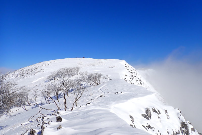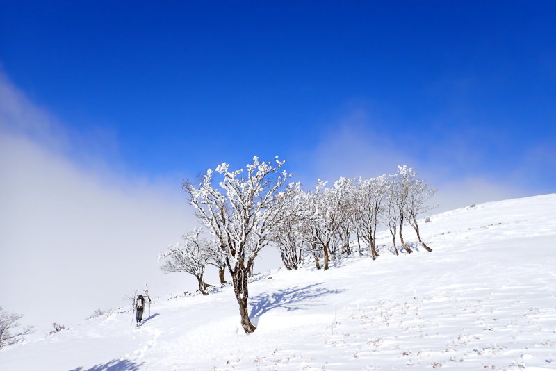 最高点の手前からは頭上には一気に青空が広がった。霧氷には青空がよく似合う。