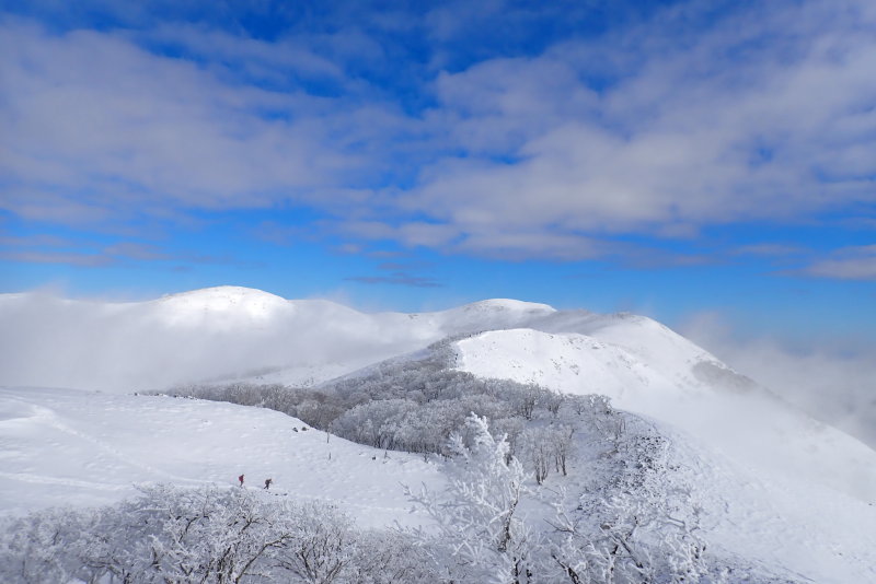 すると、まっ白な霧氷で飾られた木々が現れ、やわらかな稜線の形が浮かび上がり、ふわぁっと水色の空が。劇的な展開でしたね。