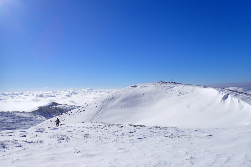 遅めに出発して正解でした。たおやかに広がるまっ白な稜線と、透き通った青い空と、たなびく白い雲が織りなす夢のような世界に出会えました。