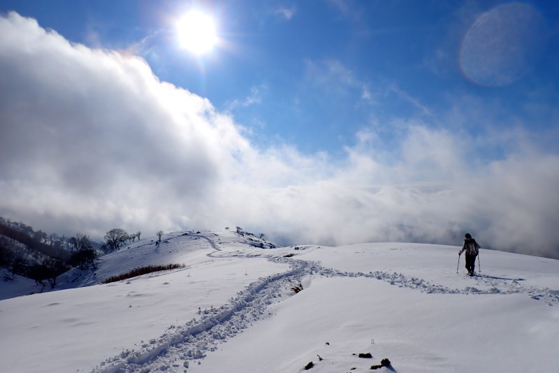 汗拭き峠への下りは、雪が重くなっていて快適ではなくなりましたね。スノーシューで少しでも長く歩きたかったのですが、途中からトレースに戻りました。