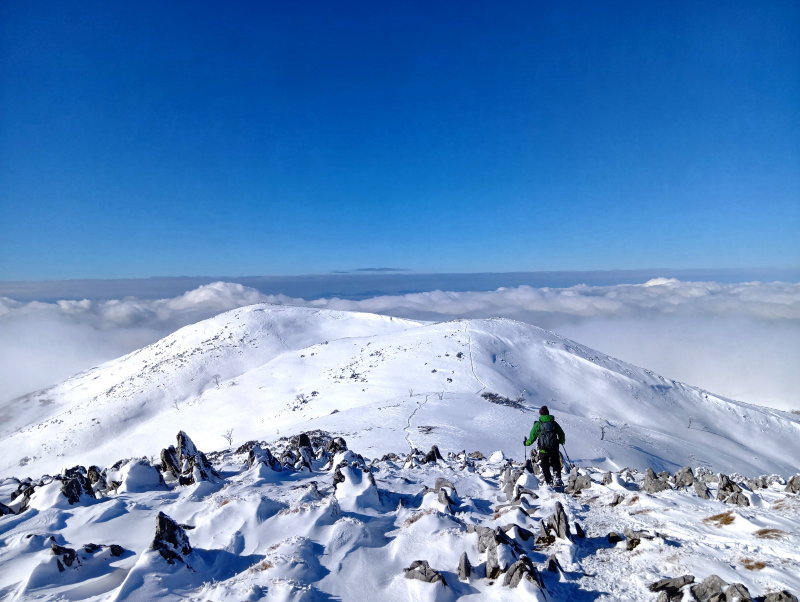 >三角点へのゆったりとした雪原が広がる尾根と、南西尾根との間に緩やかに上がってきた大洞谷の源頭が作り出すたおやかな地形は、ずっと見ていても飽きることがない。なにか日本離れした風景を感じる。他では見られることのない異次元ワールドですね。これからも冬の登山者が増えるかもしれません。