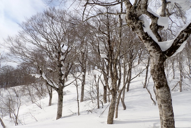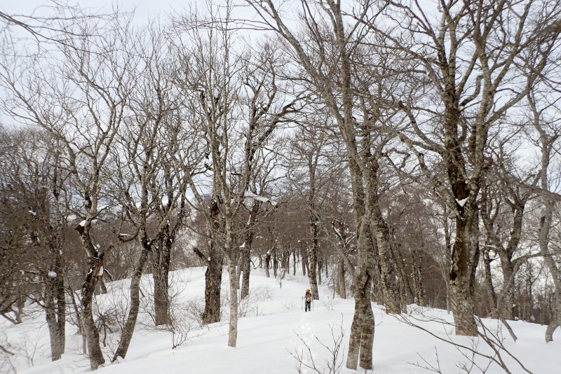 少し早めにランチを切り上げて、ほぼ空身で山頂への稜線へ踏み出した。すぐに美しいブナ林が始まる。