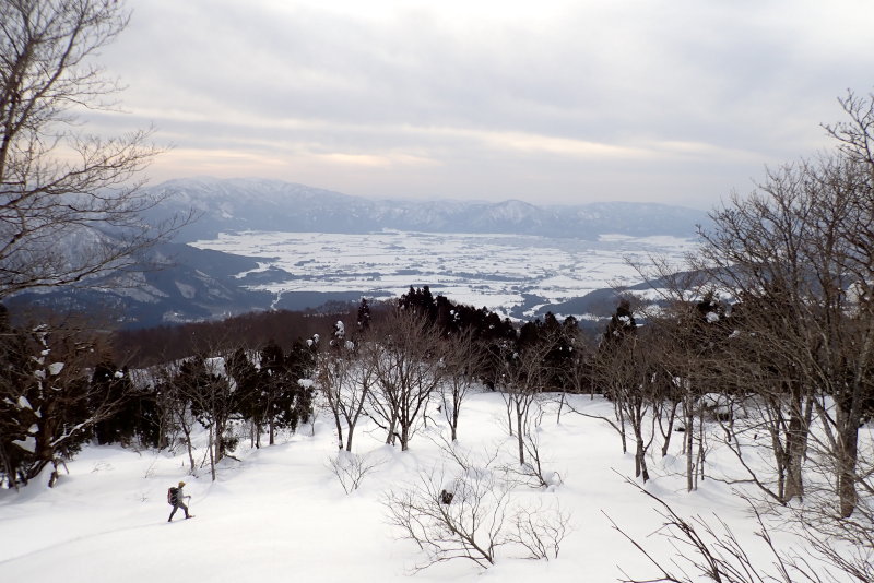 まだ白く雪化粧した大野盆地を見ながら一気に下る。登りではあれほど鬱陶しく感じた杉林も気にならない。
