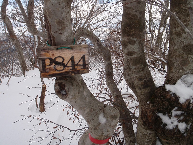 アップダウンを繰り返しながら稜線を進む。水谷分れまでくればあと少しだろう。もう11時半近い。そろそろランチタイムかな? 太尾を登り・855を越えたブナ林で登山路からそれてランチ場へ。ふと見れば、ブナの古木に美味しそうなキノコ! これはいい、お昼はナメコラーメンやな♪ と思ってよく見ればナメコではない。ナメってはいるが違うみたい。シイタケかな? 確信がない。ここで中毒になったら野垂れ死だなあ…。とりあえず戴いて帰ろう。