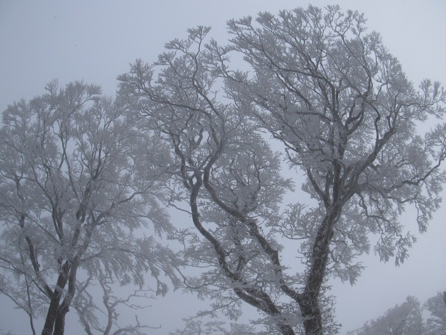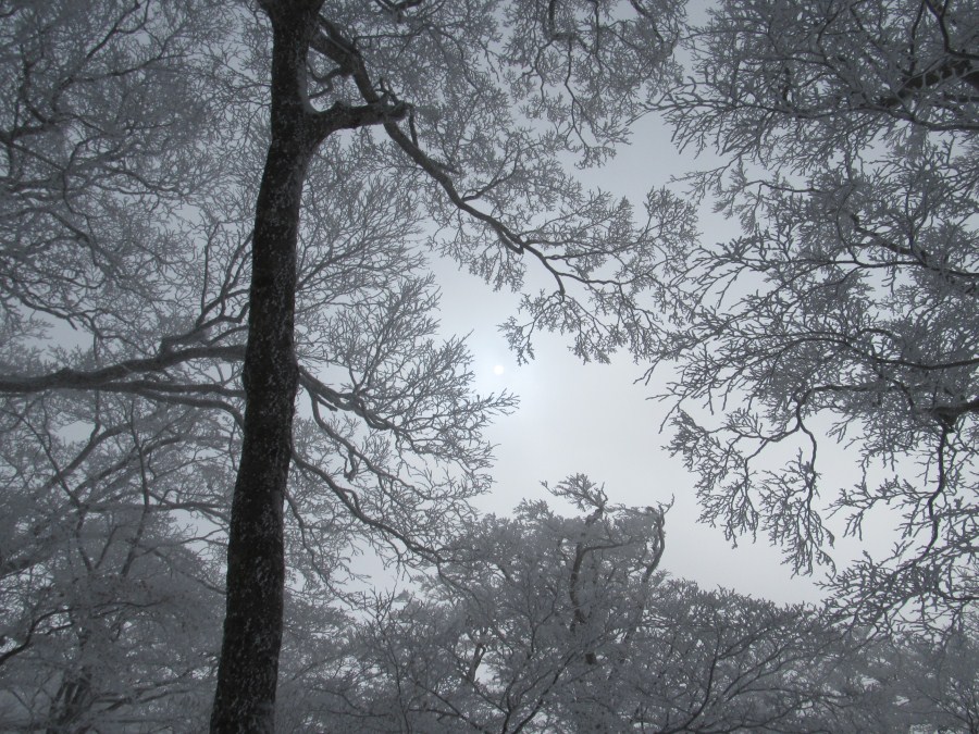 ヒキウスに上がると霧氷も一段と立派になるが一面のガスでモノトーンの世界だ、一向に晴れる気配は無い。稜線をP1394に向かう、それでも明神平からの縦走路に出るとトレースが有った。ここから私称「いにしえの森」に入る見上げる大木の枝には繊細なガラス細工の様な霧氷がびっしり、この頃になると少しガスも薄くなってきたのか僅かの間だけ陽が除く様になってきたガスを通して差し込む光は幻想的、めまぐるしく変わる景色にシャッターチャンスを狙うが上手く撮れない。