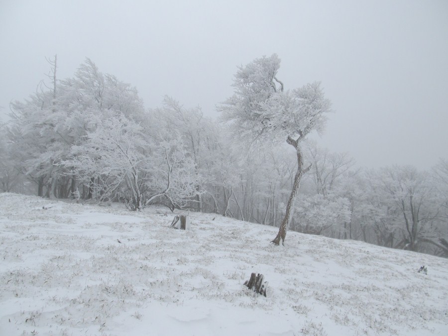 寒さと雪でペースダウン、先日のPixyさんもこんな感じだったのだろう、戻ろうかと弱気も起きるが、あと二百メートルも登ればヒキウスだと思いとどまる、岩嵓が出て来ると木にも霧氷が付きだした、今日はあわてなくても大丈夫、現在進行形で霧氷が出来ているのだろう。 やっとのことで裏ヒキウスの太陽のブナに到着、少し早いがここで昼食。今日はストーブを久しぶりに持ってきた、カレーうどんと、カップうどんを持ってきたが選んだのはカップうどん、やはり煮込むのは面倒だ。湯を沸かしてカップうどんを食べるが、私の場合放熱の方が多いのか温かくならない、残った梅酒も飲み干すがやっぱり長居は無用、やはり歩いてる方が温かいや。