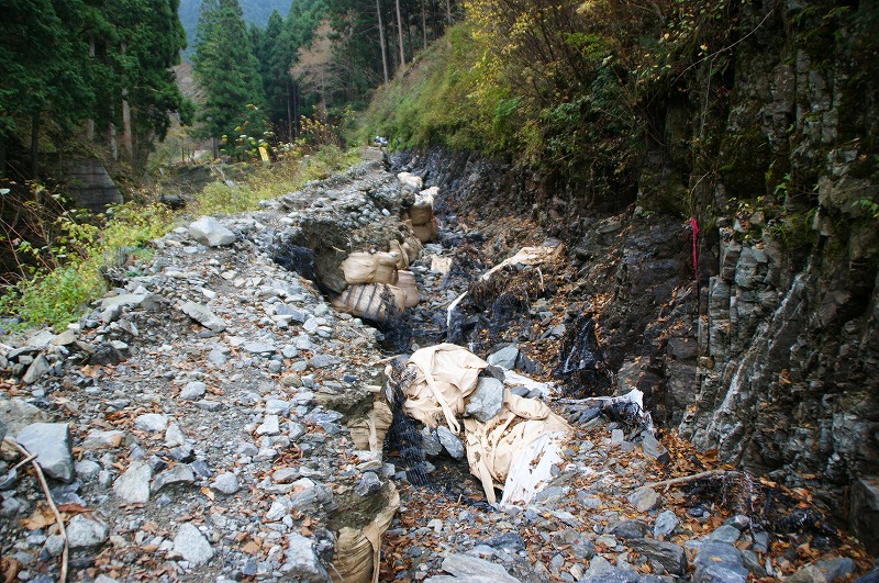 左岸側の支谷(横グラ谷?)からの出水に対して、林道下に通していた管渠の通水量が追いつかず、悦水、林道の盛土が抉られた(中略)