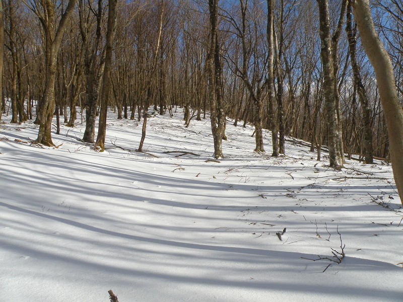まだ明神平からのトレースもない。しばらく、檜塚やヒキウス平の白い森を輝かさせて駈けぬけるスポットライトを追って楽しんむ。