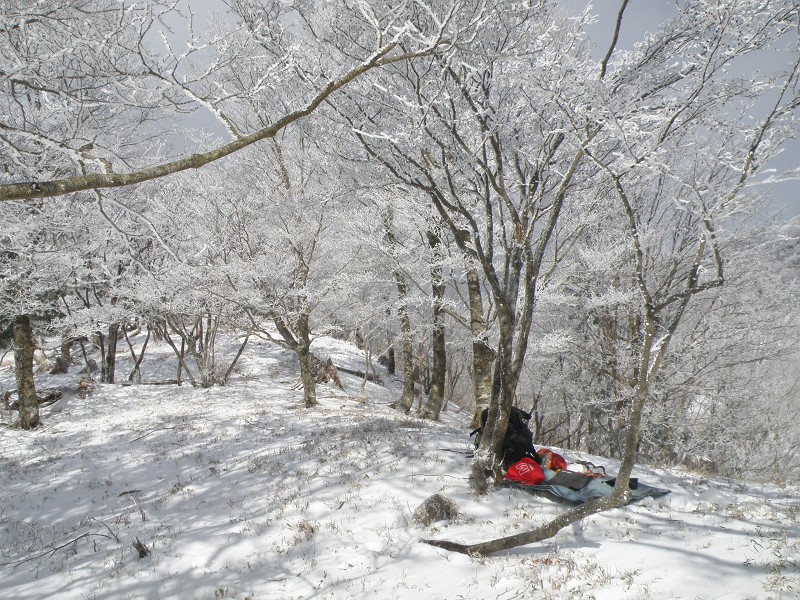 タヌキ水で水を汲み、ヌタハラ谷中間尾根でシートを広げた。きょうはホッ酎。お湯で割って、ゆっくりと輝く樹氷と青空を楽しませていただいた。。