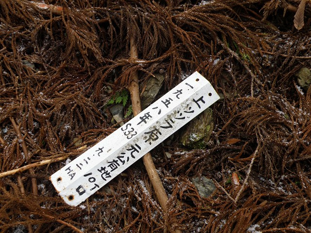 間伐材が除けられている杣道を下る、熊檻が二つ。そして「上ツヅラ原」なる1958年の年号が入った表示板が落ちていた。声に出して云えばわかるのだが、ツヅラ原が変化してツヅタ原、そして田を当て字に使い、ツヅ田原になったんだろう。葛原の方が意味が通るし。そんなことを考えながら降りていると、粉雪が舞いだし本格的に雪が降り出した。