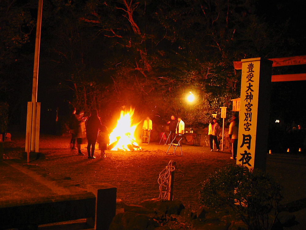 月夜見さんは宅中の氏神さまっう感じかな、パソ神社に聞けば格式高いお宮さんなんだ。篝火が焚かれて数人の世話方さんがいるの、未だ早いから詣での人はいないんだ。
