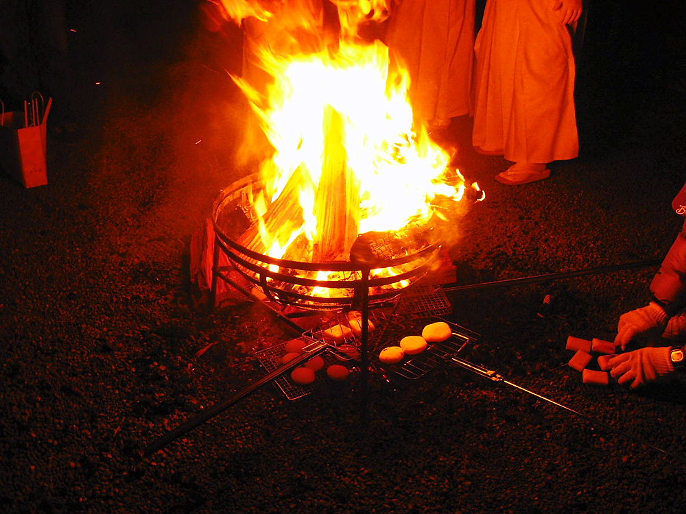 本殿にはスンナリと入れる、お詣すませ傍らの小篝火でお餅を焼いてる。緑ちゃんも準備してきたんだよな(^^)